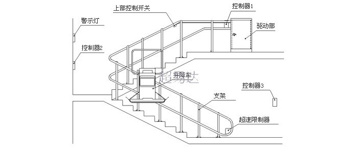 斜掛式輪椅升降平臺,一種安裝在樓道系統利用電機牽引沿著軌道上下移動并運載乘客的無障礙安全裝置。它由驅動系統、導軌、繩輪鏈、移動平臺等組成。用于建筑樓道系統中,乘坐輪椅或爬樓梯困難的人員攀爬樓梯的專用設備。主要由主驅動系統,輔助驅動系統、主控系統和安全系統組成。